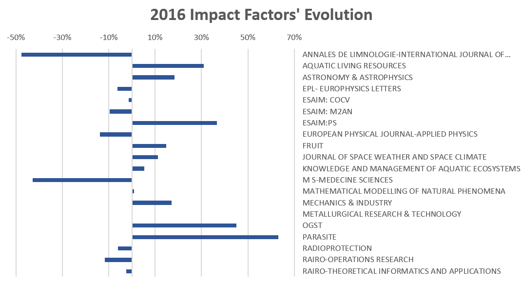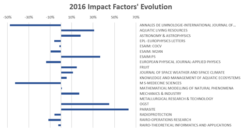 EDP has 20 journals indexed of which over half showed an increase in their impact factor, and 45% reported an increase of over 10%.