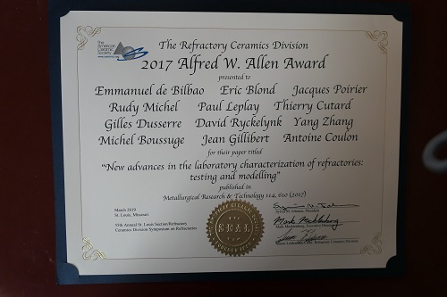 Last year we congratulated the authors of New advances in the laboratory characterization of refractories: testing and modelling for winning the 2018 Alfred W. Allen Award. The authors are: Jacques Poirier, Eric Blond, Emmanuel de Bilbao, Rudy Michel, Antoine Coulon, Jean Gillibert, Michel Boussuge, Yang Zhang, David Ryckelynk, Gilles Dusserre, Thierry Cutard, and Paul Leplay.