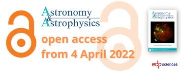From 4th of April 2022, newly accepted A&A articles will publish under a CC-BY 4.0 license allowing authors to retain the copyright and others to share and adapt the content. A Creative Commons license also enables authors to be fully compliant with the open access requirements of their institution or funding organisation(s). With the release of other articles under embargo, all content will be freely available for everyone to access and read.