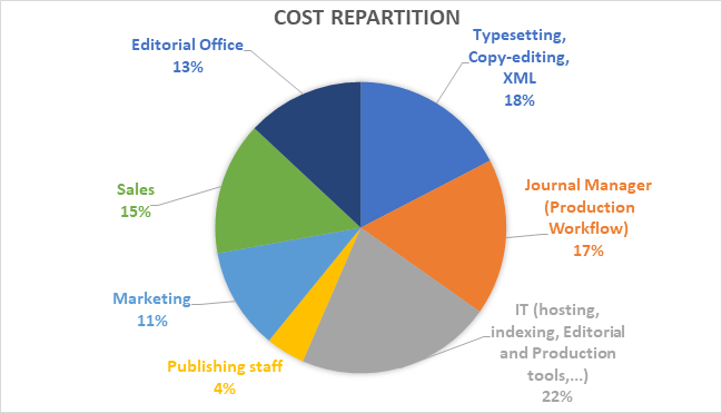 The cost of electronic publication of a paper at EDPS is between 1200€ and 1500€. The typical breakdown of publication costs for a journal is presented below. Please note that variations to this cost structure may depend on: the size of the journal (number of pages published), the business model (open access, subscription…), the editorial system used, the nature of services provided for the journal (including 3rd party services such as ORCID, Publons, iThenticate, COPE, etc), and so on.